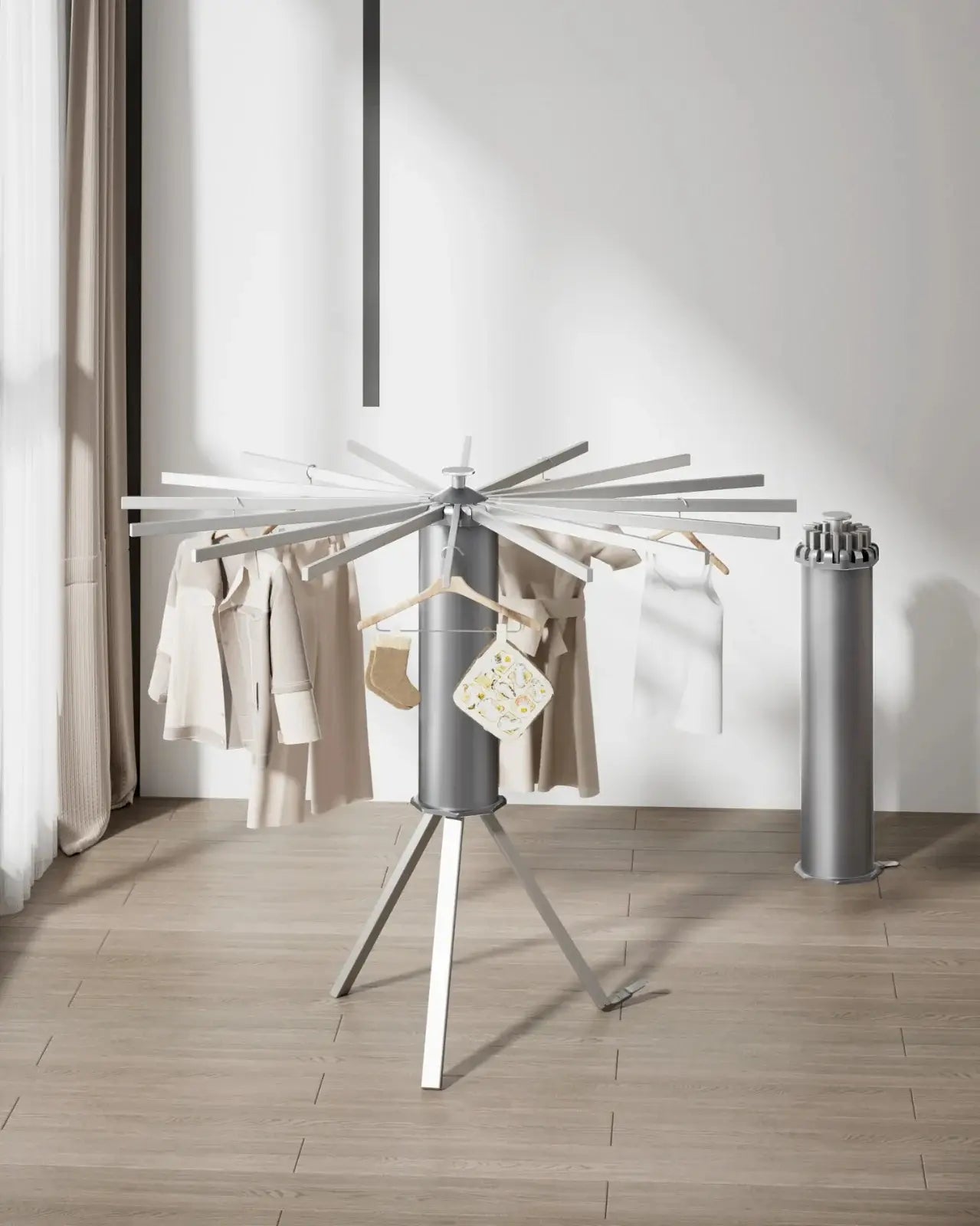 Gira 360° para mayor comodidad al colgar y recoger.
